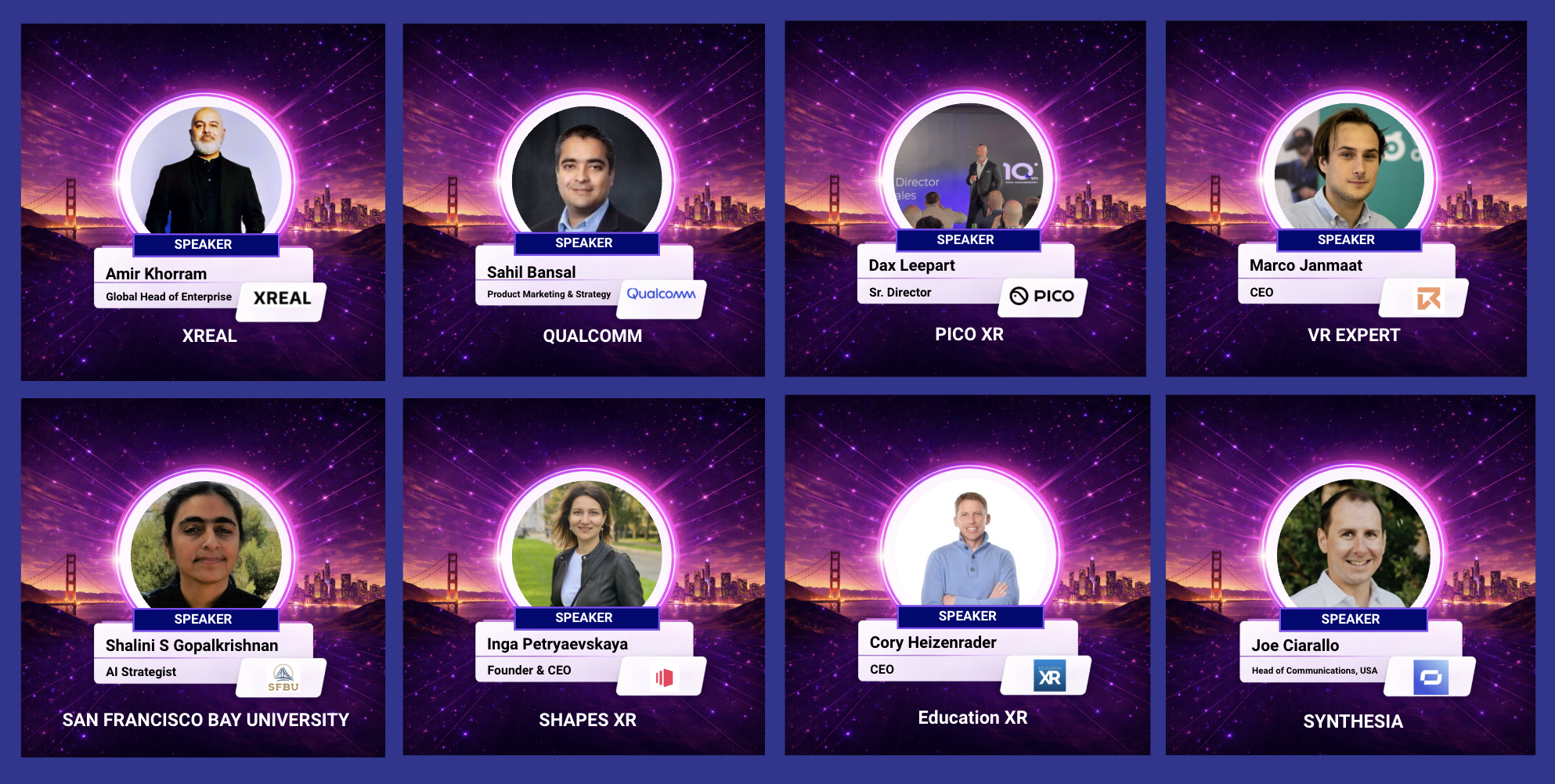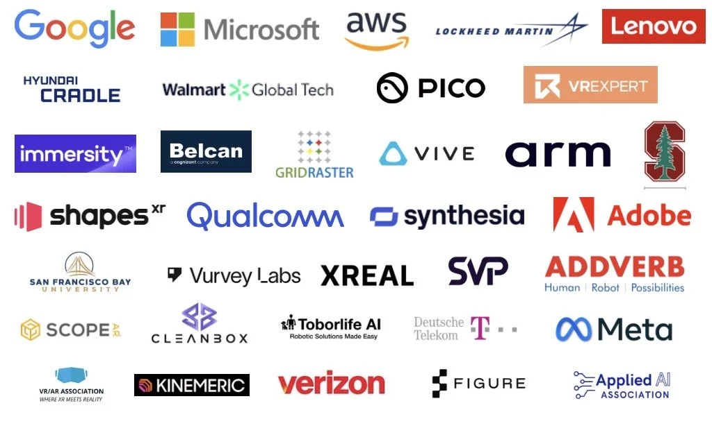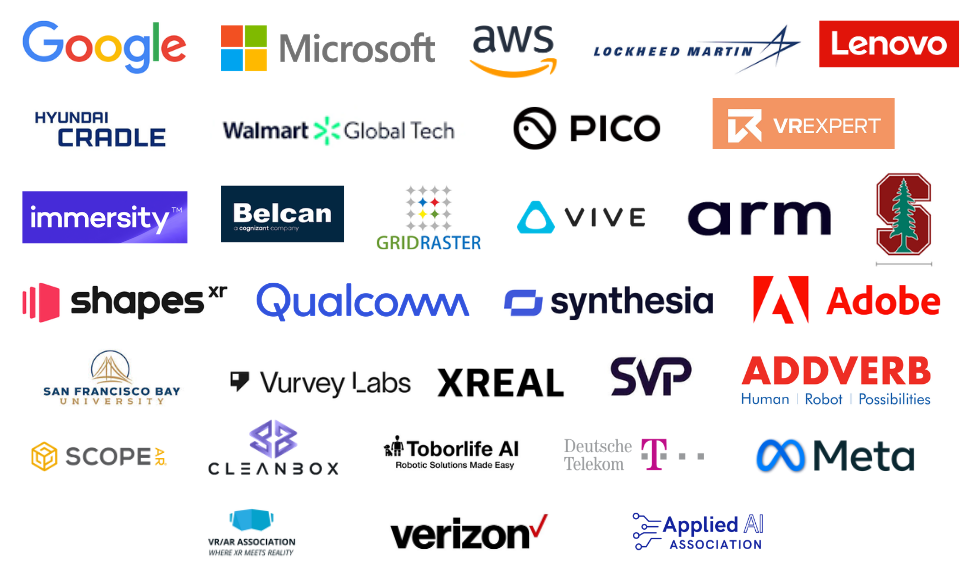 Google · Microsoft · AWS · Adobe · Qualcomm · Lockheed Martin · Walmart · ARM · Stanford · Lenovo · Hyundai CRADLE · Leia Inc. · HTC VIVE · Pico · VR Expert · Belcan · San Francisco Bay University · Synthesia · ADDVERB · Shapes XR · XREAL · Meta · Verizon · Toborlife AI · Deutsch Telekom